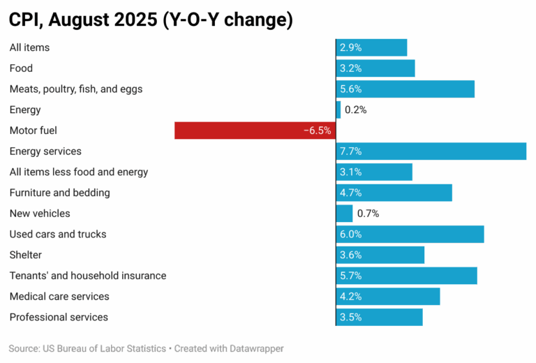 Consumer prices in the United States rose 2.9% in August 2025 compared with the same month a year earlier, and up slightly from July’s 2.7% increase. A broad set of import tariffs likely contributed to the acceleration in inflation, particularly for goods sourced from overseas. Imported consumer products showed some of the largest price gains. Coffee prices jumped 20.9% y-o-y, while furniture costs rose 4.7%. Everyday expenses also climbed, with overall food prices up 3.2%, largely due to higher restaurant prices. Among grocery staples, egg prices surged 10.9%, and apples were up 9.6% from last year.