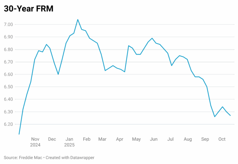 The 30-year fixed mortgage rate averaged 6.27% as of October 16, 2025, according to Freddie Mac, roughly 20 basis points lower than the 6.44% recorded a year earlier. While this marks one of the lowest levels of the year, the modest decline offers little meaningful relief to potential buyers. With the median U.S. home price rising from $414,000 in August 2024 to $422,000 in August 2025, the benefit of lower rates is largely offset by higher property values. For buyers making a 20% down payment, estimated monthly mortgage payments remain nearly unchanged.