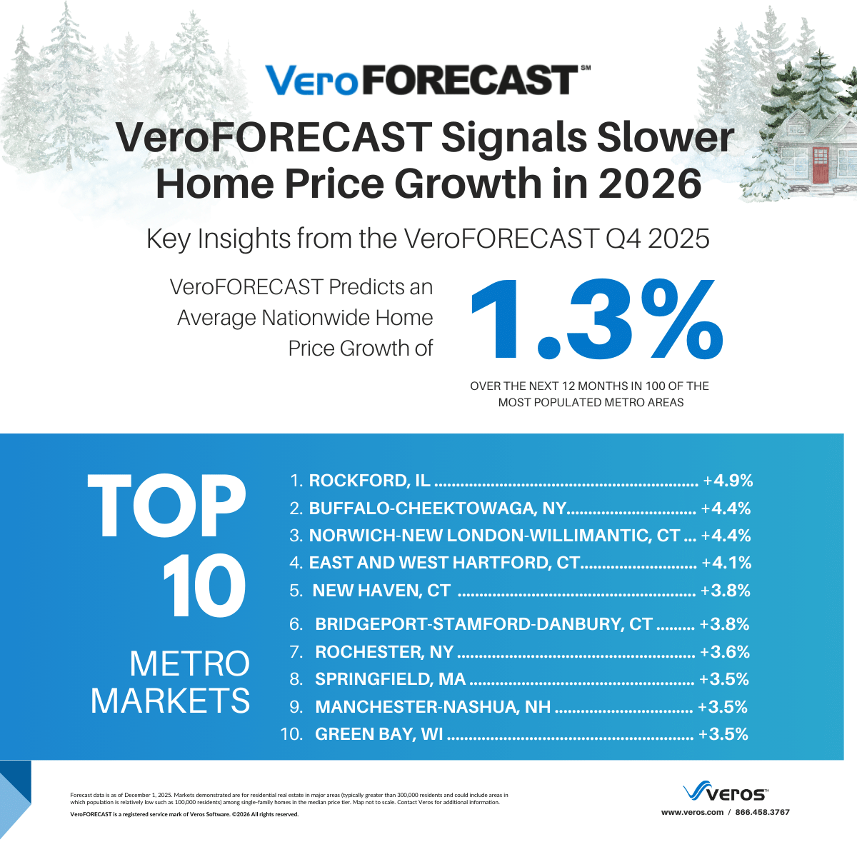 SANTA ANA, Calif., January 7, 2026 —Today, Veros Real Estate Solutions (Veros®), an industry leader in enterprise risk management and collateral valuation services, its Q4 2025 VeroFORECASTSM. The forecast projects an average-nationwide home price appreciation rate of 1.3% over the next 12 months.